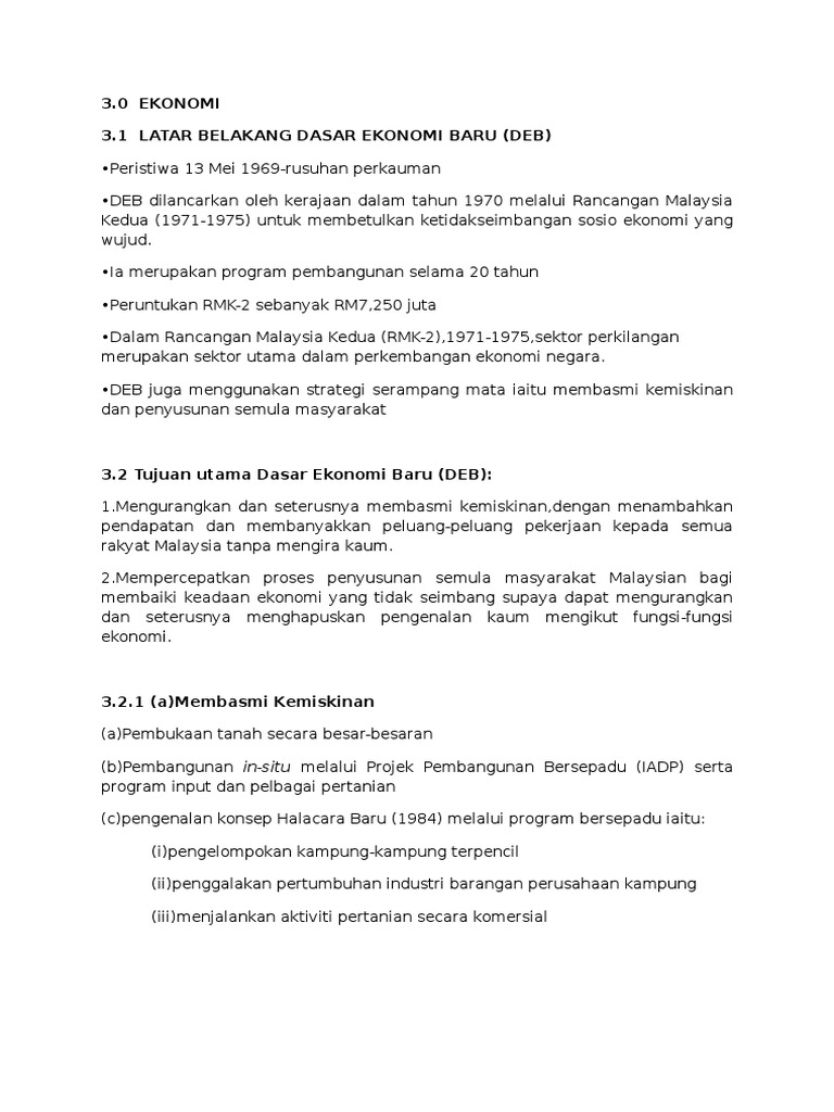 Dasar Ekonomi Baru from s1.studylibid.com Matlamat utama mengapa dasar ekonomi baru diasaskan adalah untuk. Dasar ekonomi baru merupakan satu bentuk perancangan yang dilancarkan oleh kerajaan dalam tahun 1970 melalui rancangan malaysia kedua. Oleh itu, pembasmian kemiskinan merupakan salah satu usaha kerajaan dalam pelaksanaan deb kerana kemiskinan bukan sahaja berlaku di luar bandar. Bagi singkatan dasar ekonomi baru iaitu deb. Prinsip ekonomi prinsip ekonomi menurutmankiw adalah dasar berpikir yang digunakan manusia untuk memaksimumkan suatu tujuan melalui pengorbanan tertentu, atau untuk mencapai tujuan tertentu dengan pengorbanan sekecil mungkin (mankiw, 2011). Majlis perundingan negara juga telah mencadangkan kepada kerajaan untuk mewujudkan jabatan perpaduan negara untuk melaksanakan. Pendidikan jasmani by asyikin hashim 4500 views. Matlamat dan strategi deb ialah 'serampang dua mata' iaitu untuk mengurangkan dan membasmi kemiskinan, meningkatkan pendapatan dan memperbanyakkan lagi.