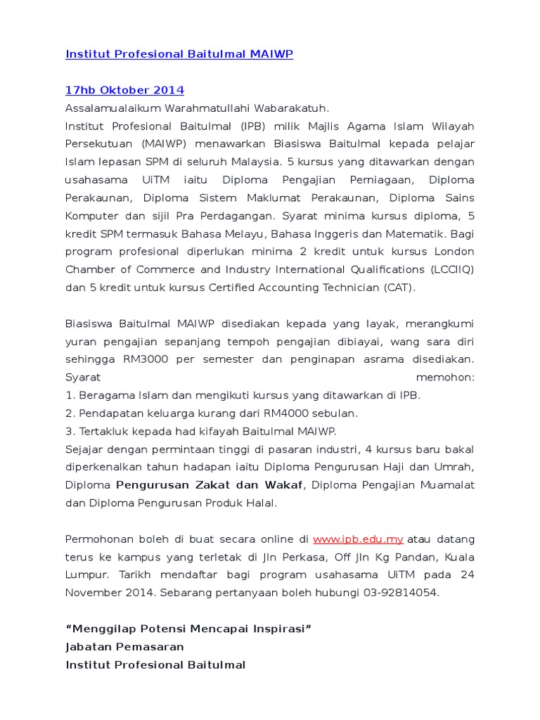 Institut profesional baitulmal, lot 1363 jalan perkasa, off jalan kg. Instituto profesional baitulmal es una ruta 2.7 km (de 4.000 pasos) ubicada cerca de pandan, kuala lumpur, malasia. Berikut dikongsikan panduan cara membuat permohonan institut profesional baitulmal buat rujukan calon. Ipb menyediakan kelas persediaan kepada pelajar yang lemah berbahasa inggeris dan matematik sebelum diterima masuk ke program sijil dan diploma. Program homegrown (dphu, dpzw, dpm dan dpih).