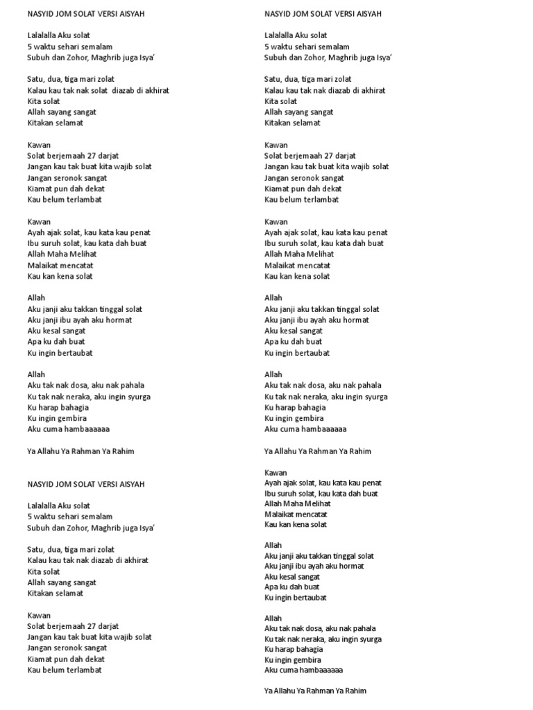 Mulia indah cantik berseri kulit putih bersih merah dipipimu dia aisyah putri abu bakar istri rasullallah. Nasyid jom solat versi aisyah. Berikut ini adalah lirik lagu aisyah istri rasulullah versi bahasa arab. Aisyah #karaoke bagi anda yang mau pakai karaoke versi kami, silahkan saja. Nah, seperti apakah lirik lagu aisyah istri rasulullah versi arab ini? Comment must not exceed 1000 characters. Home film & musik berita lirik lagu. Download lagu mp3 & video: 19 august 2017 / tebarkan kebaikan. Are you see now top 10 lagu aisyah versi solat lirik results on the web. Sertakan link/tag kita di deskripsi kalian. كُلُّ النِّسَاءِ تَؤَدّ أَنْ تَكُون مِثلَكي khulu nisai tawadhuan takuna mislaki. Nasyid solat versi lagu aisyah mp3 duration 1:55 size 4.39 mb / khamis kabil 10.